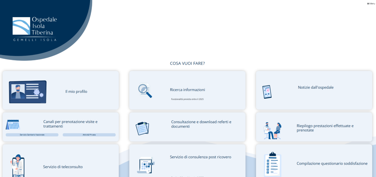 L’Ospedale Isola Tiberina – Gemelli Isola ha avviato lo sviluppo dell’Isola del Paziente con l’obiettivo di integrare e semplificare l’accesso ai servizi digitali, oggi frammentati in canali distinti e disomogenei. Il progetto intende rafforzare il ruolo attivo del cittadino nella gestione del proprio percorso sanitario, favorendo la prevenzione attraverso strumenti che consentano di monitorare le prestazioni effettuate e programmare quelle future. In tal modo si promuove una maggiore consapevolezza del proprio stato di salute, riducendo i rischi legati a ritardi diagnostici o a mancate adesioni a screening e follow-up. Ulteriori obiettivi riguardano il miglioramento della qualità dell’esperienza digitale, l’ottimizzazione dei processi interni e la riduzione dei costi gestionali. Il Portale si configura come leva strategica per l’innovazione e la sostenibilità del sistema sanitario, orientato a coniugare efficienza organizzativa e centralità della prevenzione a beneficio dei pazienti.