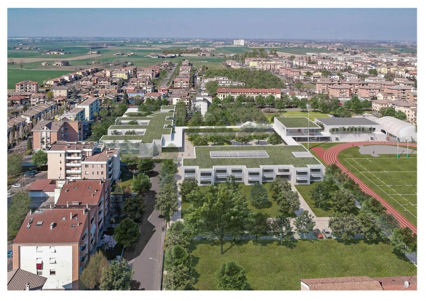 L’intervento si propone di realizzare un polo scolastico innovativo, sostenibile e caratterizzato da un’elevata qualità architettonica, capace di rispondere alle nuove esigenze educative e di offrire spazi funzionali, flessibili e orientati al benessere degli utenti. L’obiettivo non è soltanto quello di costruire un edificio scolastico moderno, ma di dar vita ad un complesso realmente aperto alla cittadinanza, in grado di accogliere attività culturali, formative e sociali anche fuori dell’orario scolastico, diventando così un punto di riferimento per l’intera comunità. Parallelamente, il progetto mira a rafforzare l’identità urbana e a migliorare la qualità dello spazio pubblico, contribuendo alla definizione di un luogo riconoscibile, accogliente e integrato nel contesto urbano. In questa visione, scuola, sport, cultura e servizi vengono concepiti come parti di un unico sistema, capace di generare nuove opportunità di relazione promuovendo una crescita armoniosa del tessuto sociale.