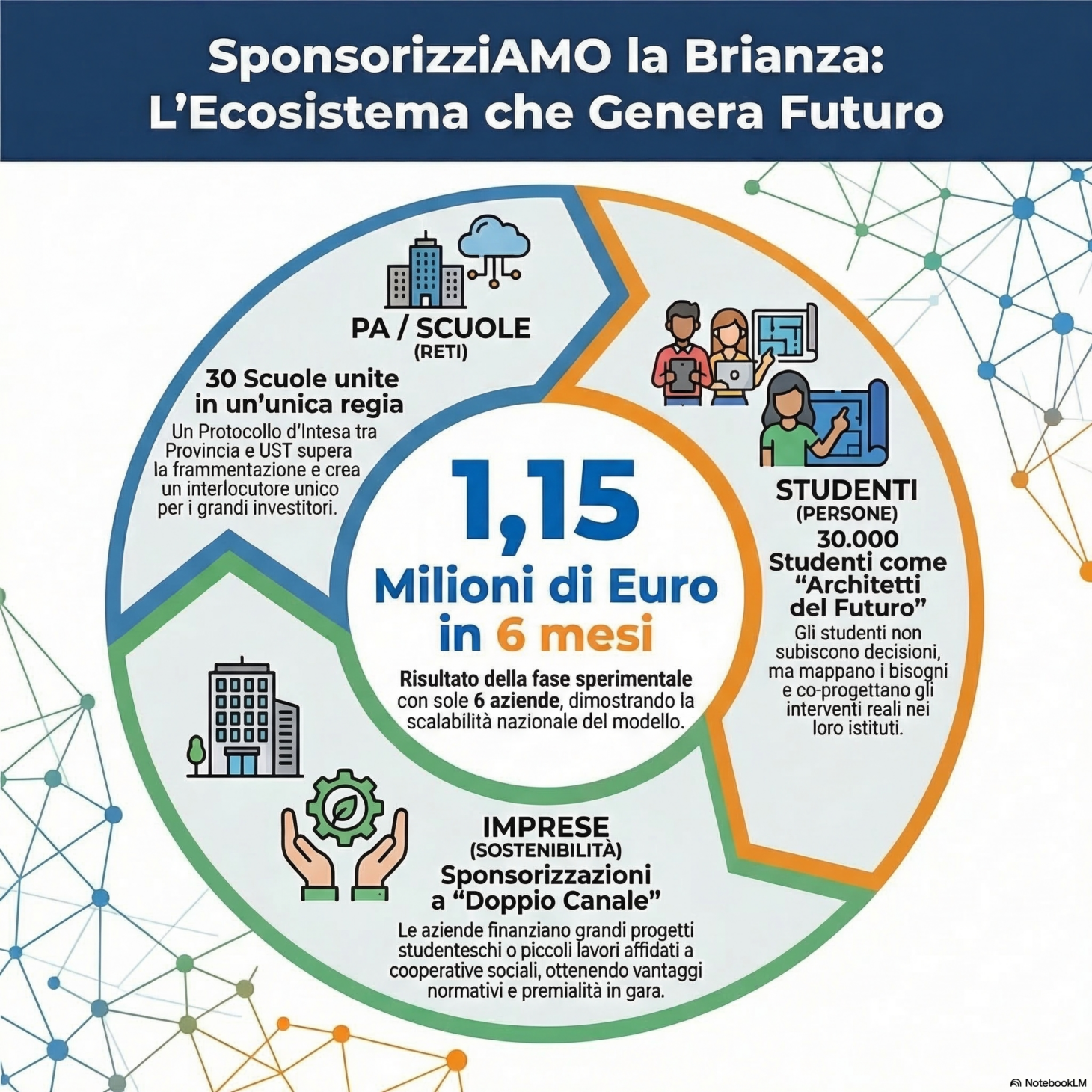 “SponsorizziAMO la Brianza” è un’architettura istituzionale anticipatoria che risolve la carenza di fondi scolastici costruendo un ecosistema territoriale. Il cuore è un Protocollo d’Intesa (Provincia MB – UST) che unisce 30 scuole sotto un’unica regia. Tramite l’azione “Dall’Aula al Progetto” (nei percorsi FSL), 30.000 studenti mappano i bisogni e co-progettano gli interventi. Il Bando di Sponsorizzazione si articola su due canali: da un lato, le aziende finanziano direttamente i progetti ideati dai ragazzi (valore etico); dall’altro, finanziano piccoli interventi ordinari (verde, decoro) eseguiti da cooperative di tipo B. Le imprese sono incentivate a partecipare da tre leve: etica, compliance normativa (per adempiere agli obblighi sulle assunzioni protette ed evitare sanzioni) e premialità nelle gare pubbliche (Art. 20 Regolamento). Il sistema, supportato da un portale cloud in evoluzione verso l’AI, ha già generato fiducia: in 6 mesi sono stati raccolti 1.145.000 euro da 6 aziende.